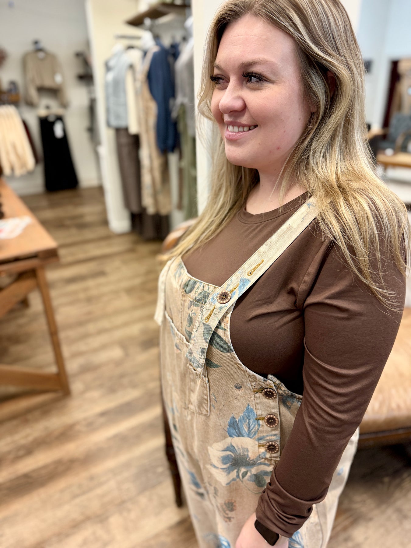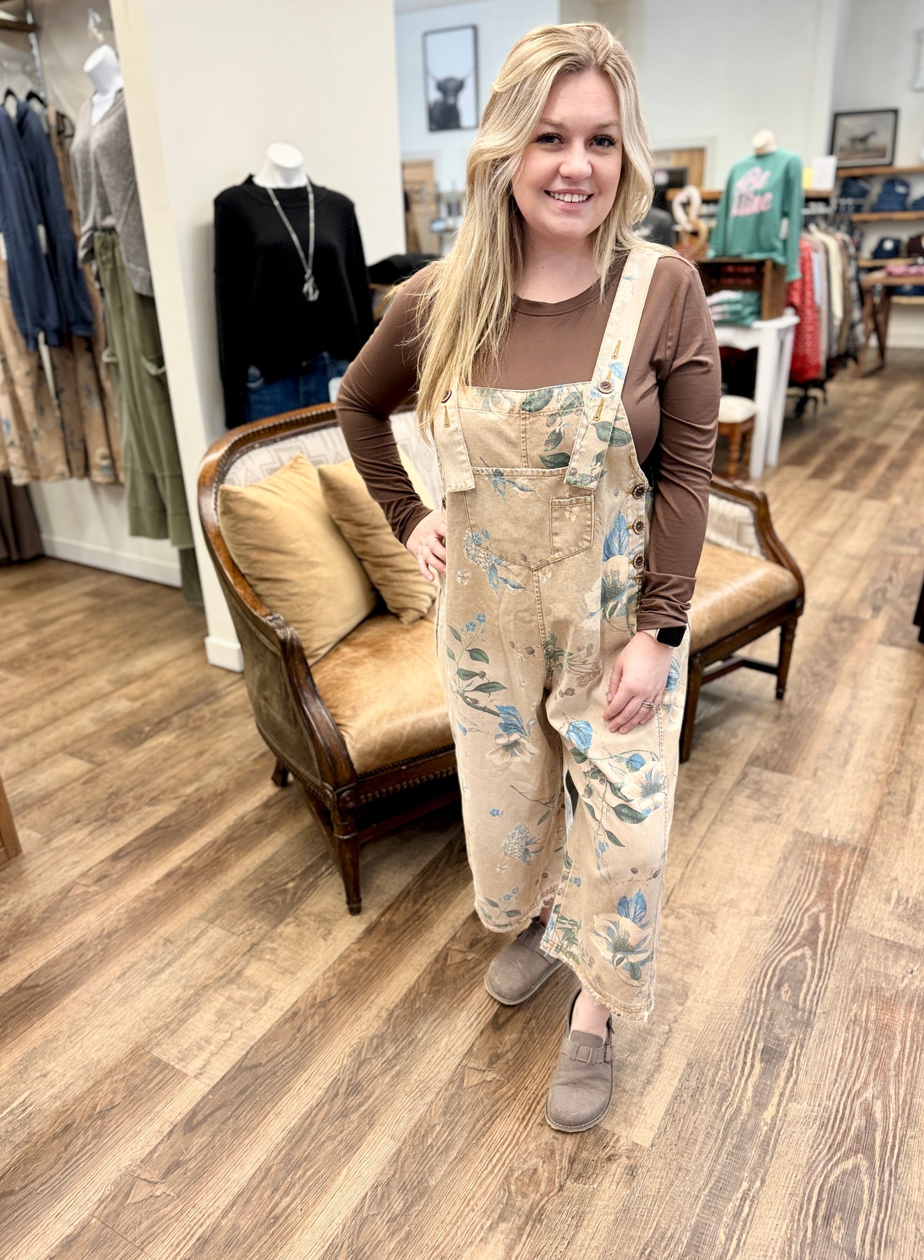 Bring effortless charm to your everyday style with these relaxed, floral-print overalls. The soft mocha denim and cropped silhouette make them perfect for casual days, layering, or weekend adventures—you’ll love how easy they are to style! The model is wearing a