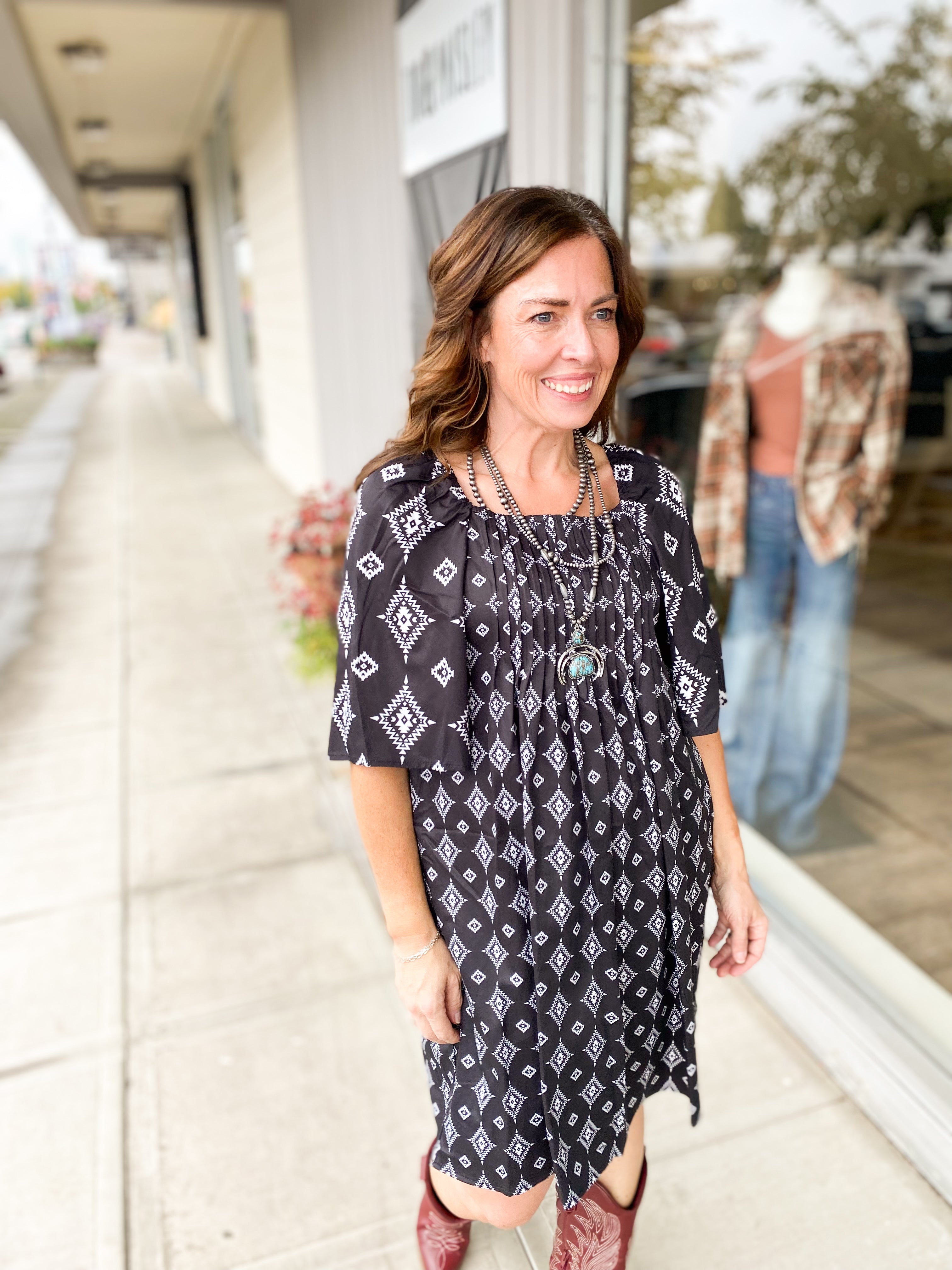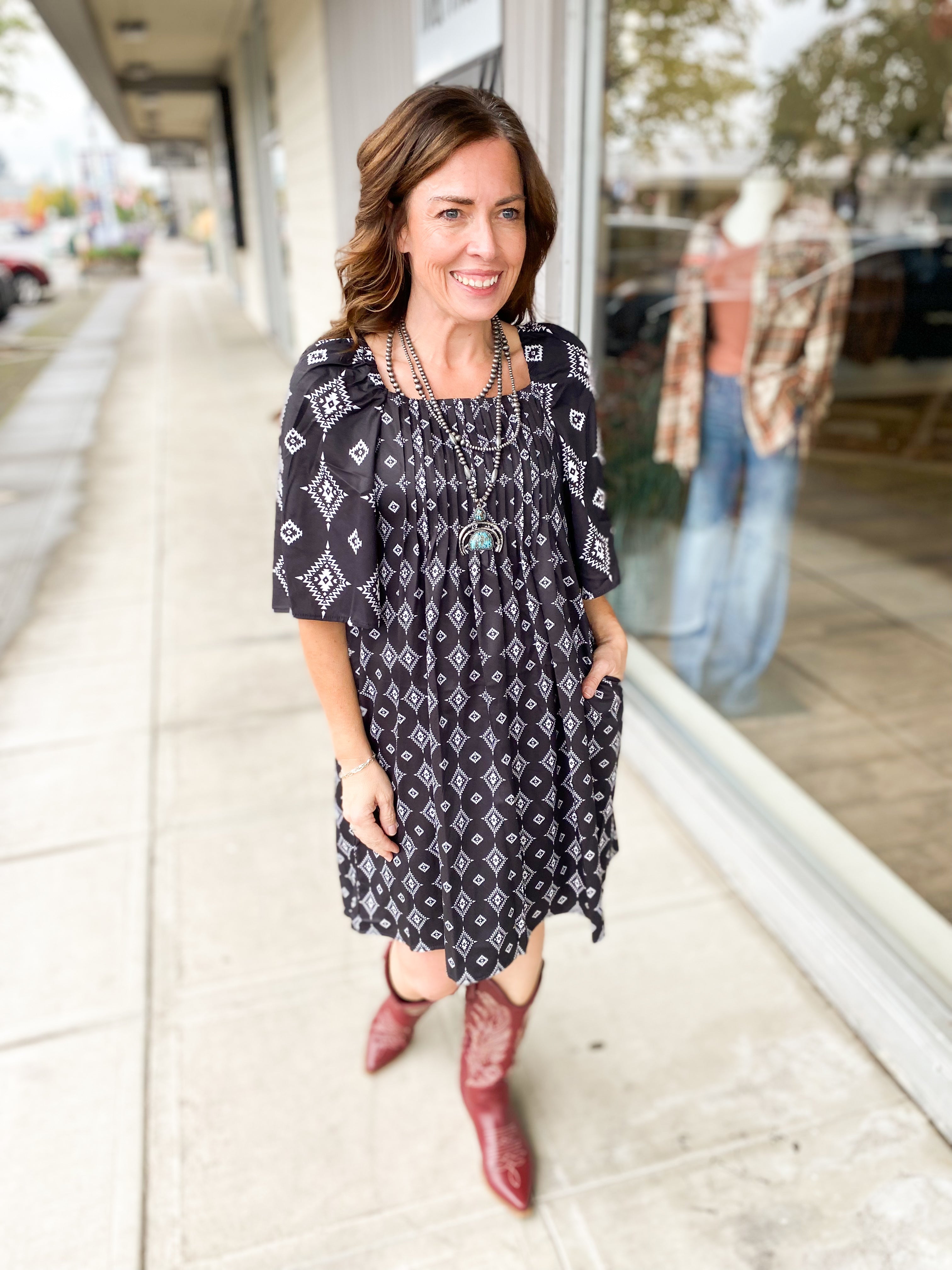 - Western-inspired dress, with a flowy silhouette that flatters every figure.