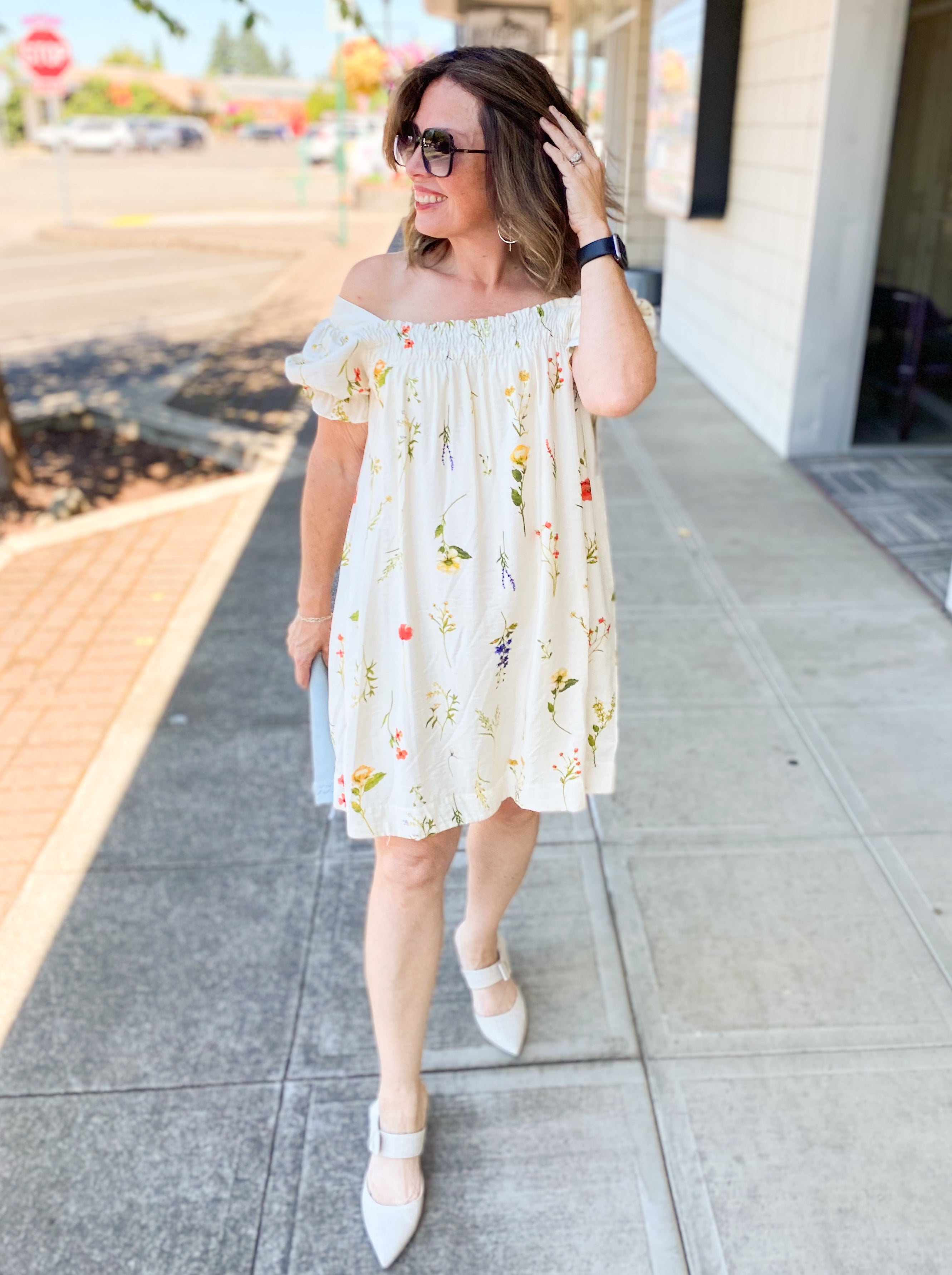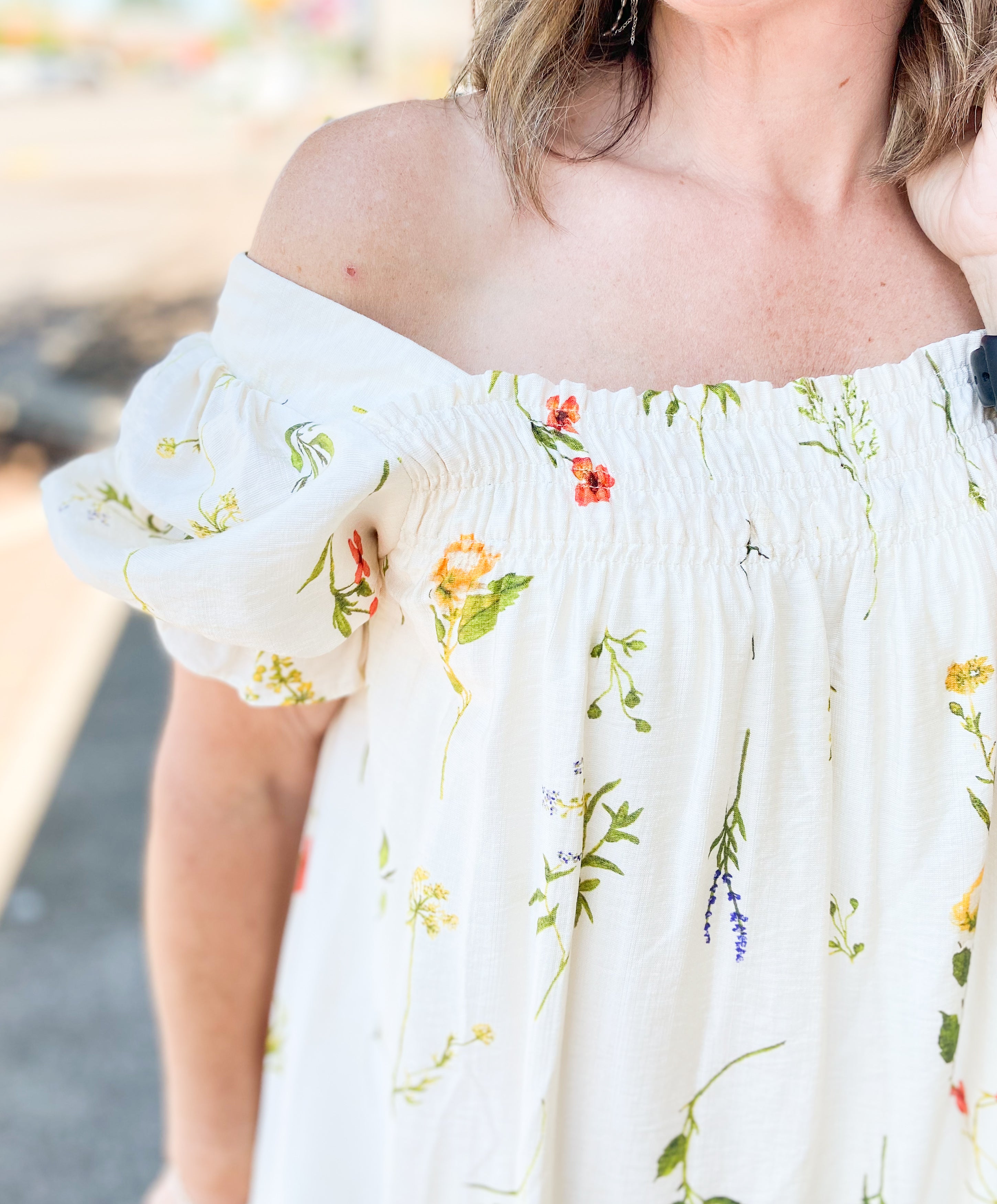 - Floral print, with square neckline, puffsleeve with small elastic ruffle