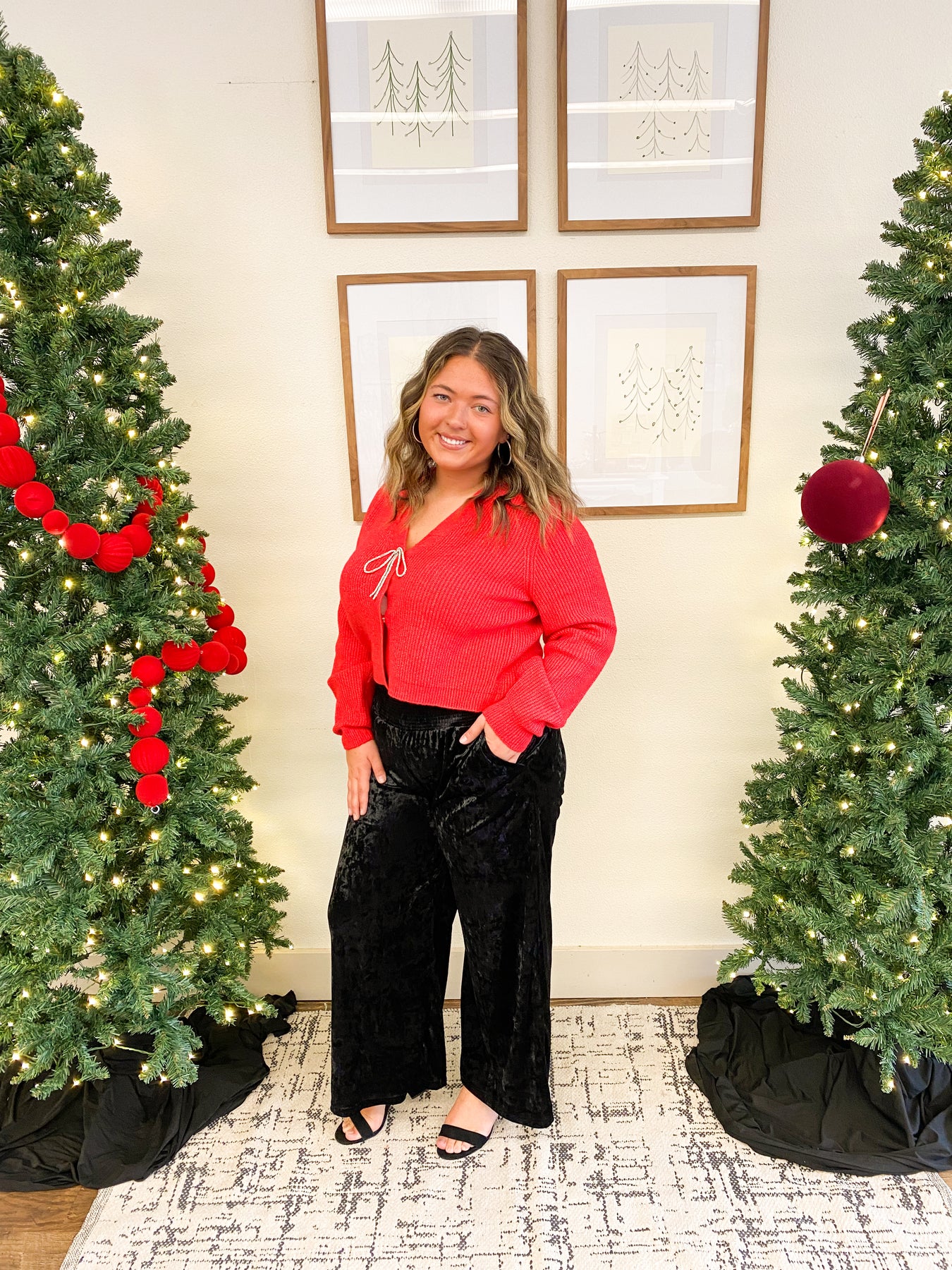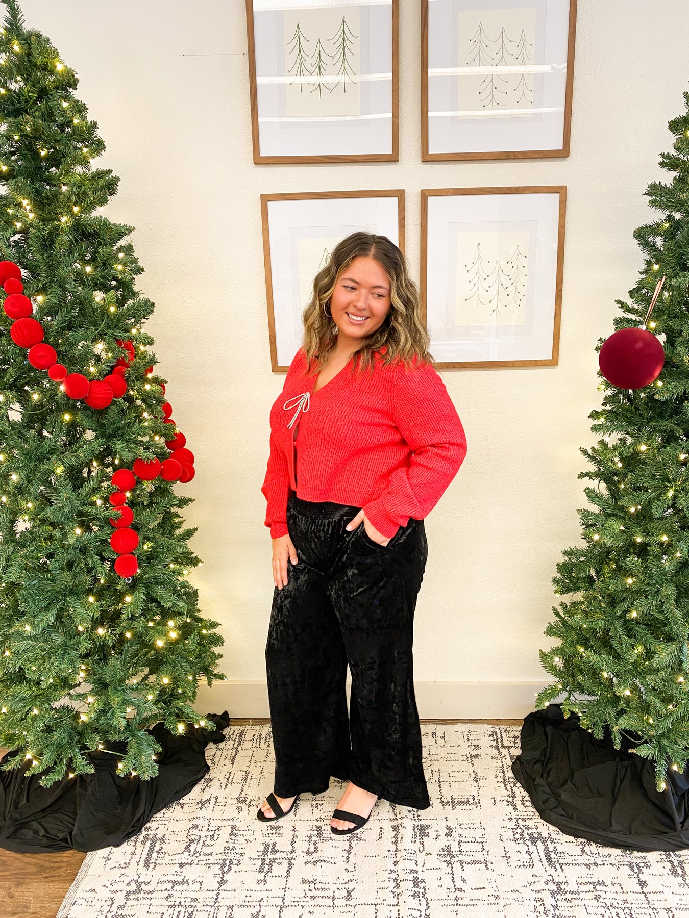 • Knit V neck cardigan with snap buttons and rhinestone bow detail