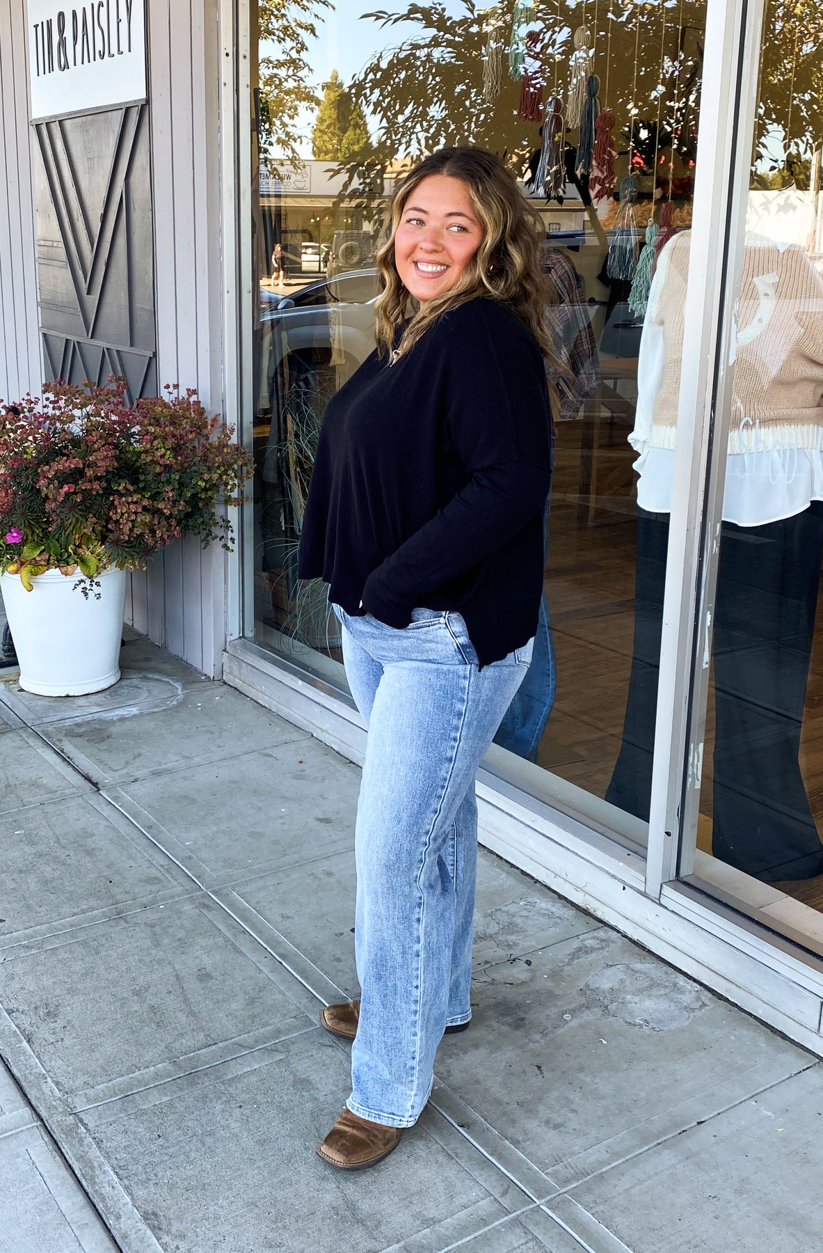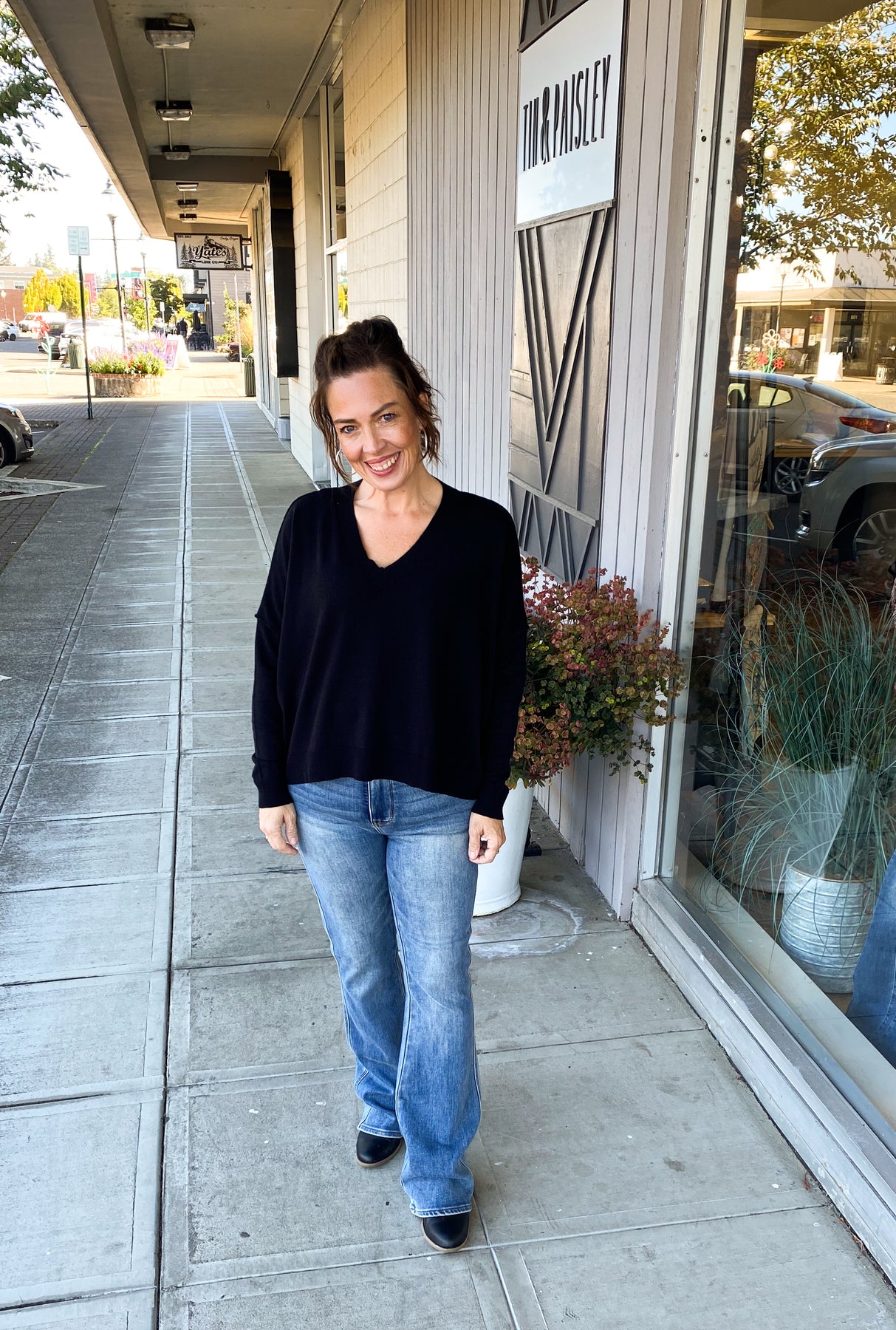 Woman wearing a black sweater and blue jeans standing outside a store.