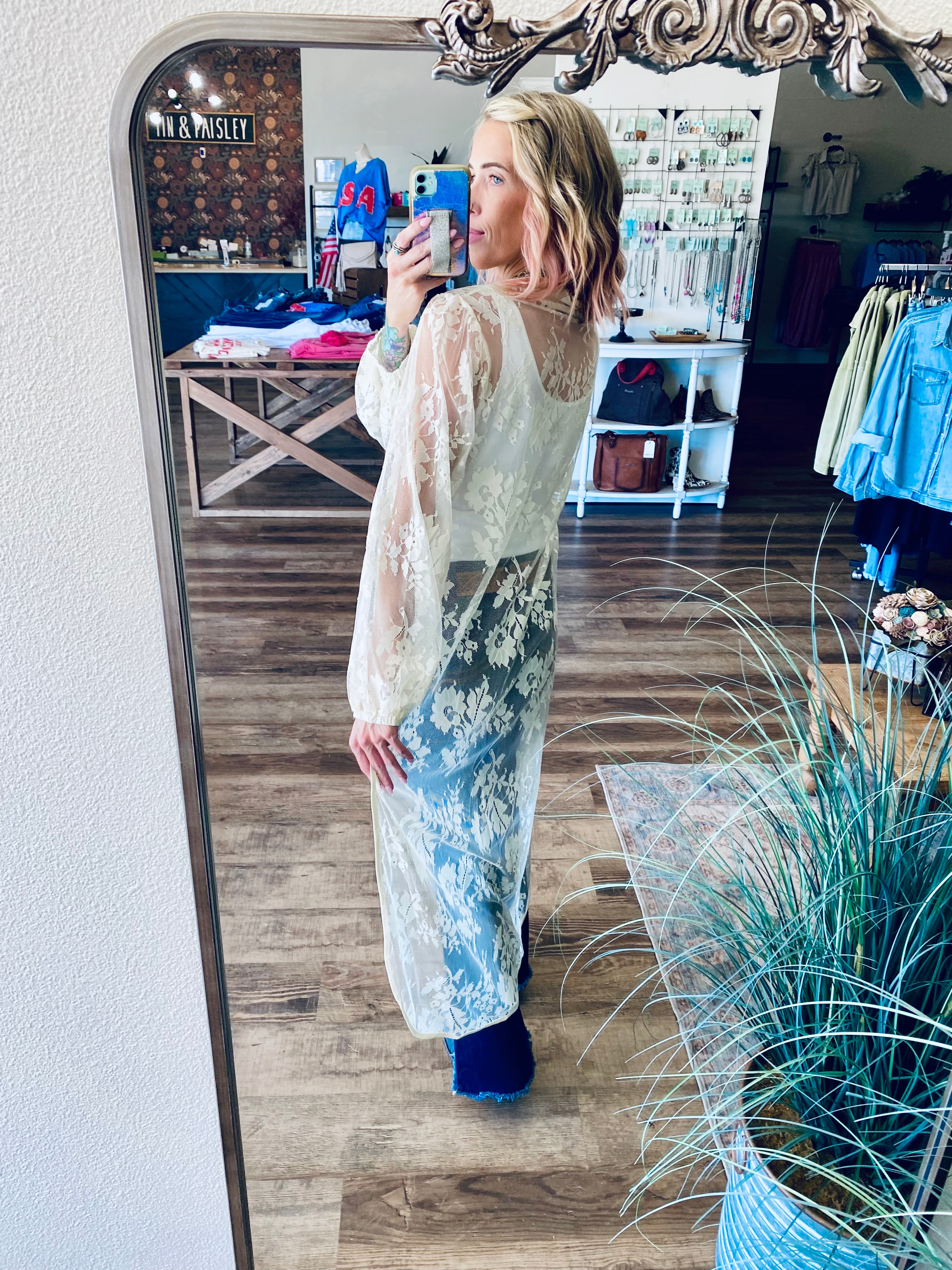 - Floral lace top, drop-down back, mock neck